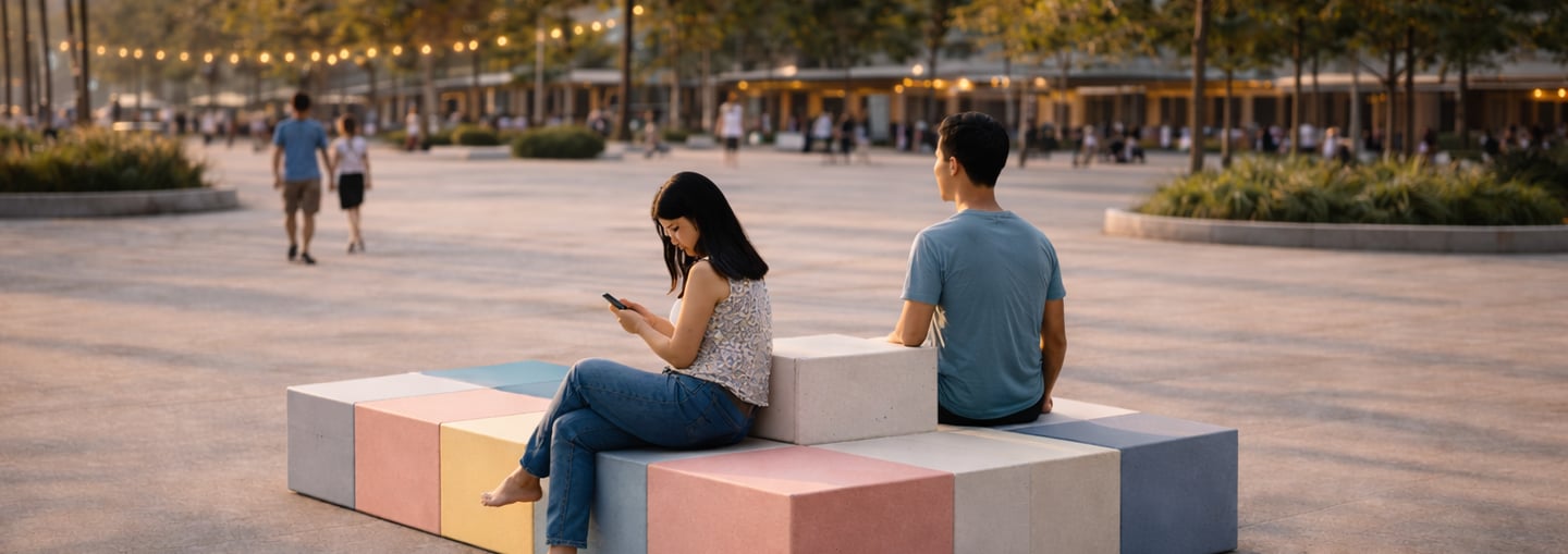 Large-scale interactive objects designed to encourage gathering, pause, and interaction in open urban environments.